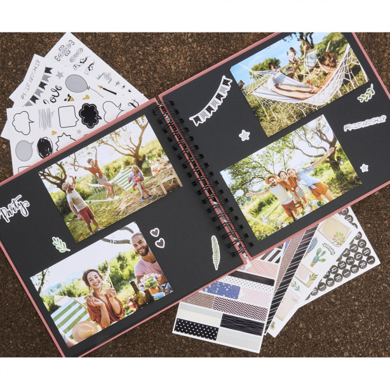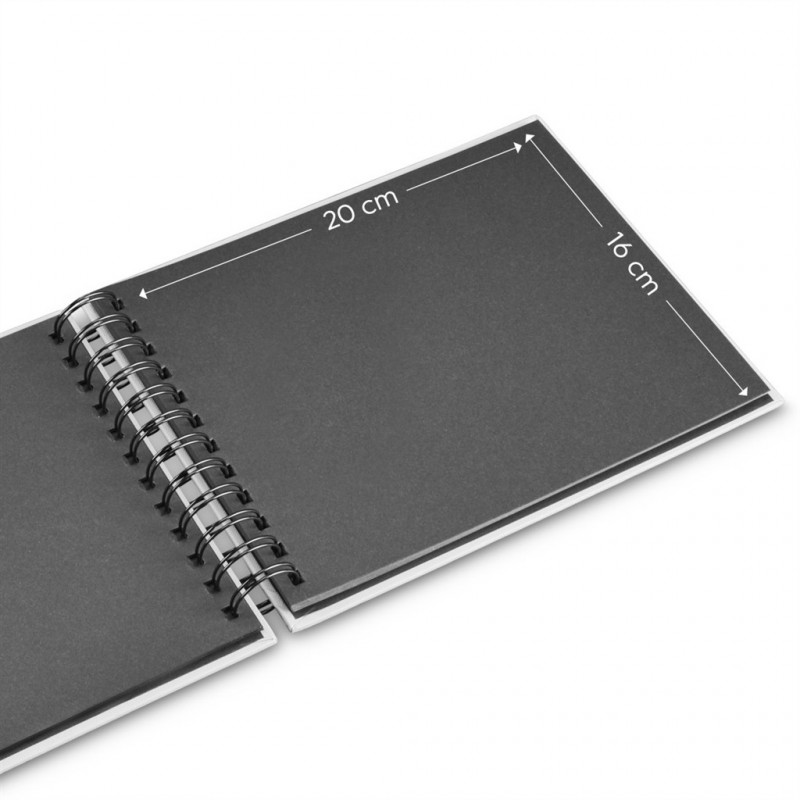 - čierne vnútorné listy poskytujú priestor pre vaše príbehy a spomienky (fotografie, kresby, texty, pohľadnice, vstupenky …)
