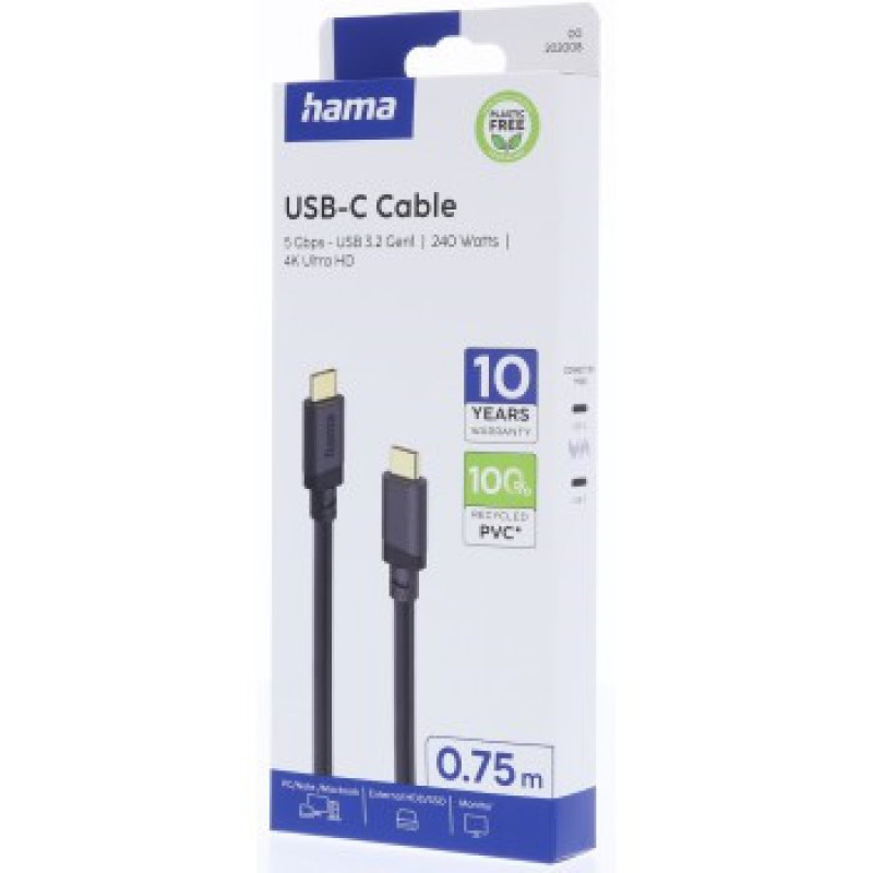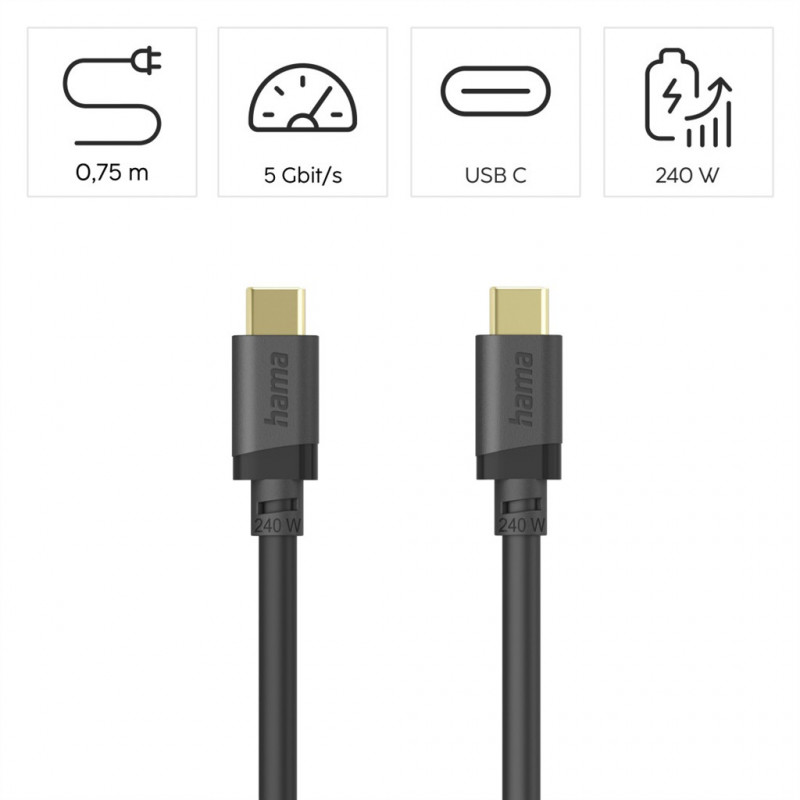Hama USB C-C kábel 0,75 m, USB 3.2 Gen1 5 Gb/s, 240 W, čierny