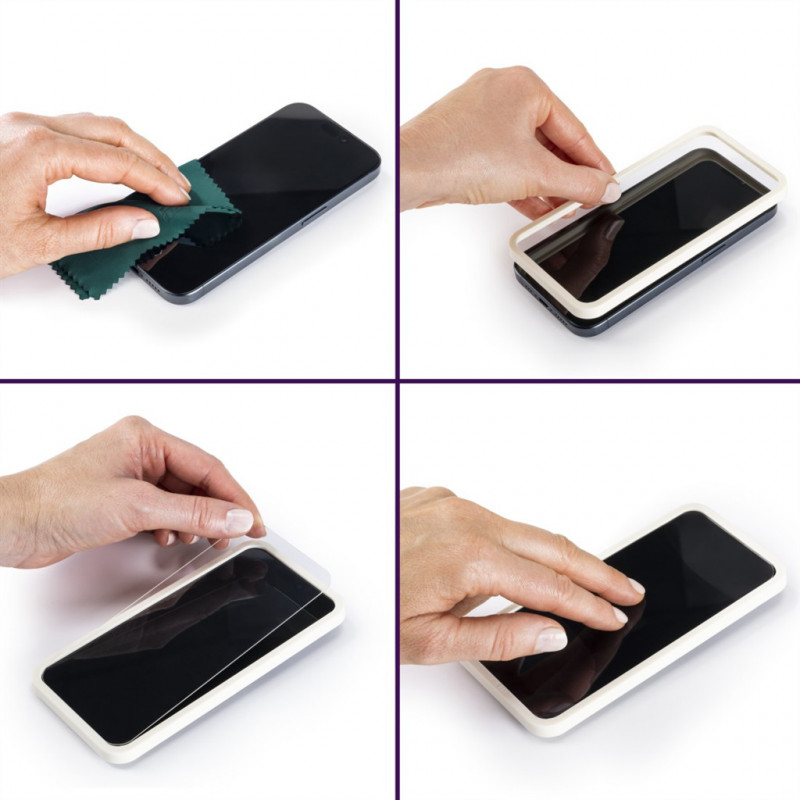 - jednoduchá aplikácia v 3 krokoch: vyčistite displej telefónu, umiestnite EcoFrame upevňovaciu pomôcku na displej a následne umiestnite na vrch ochranné sklo