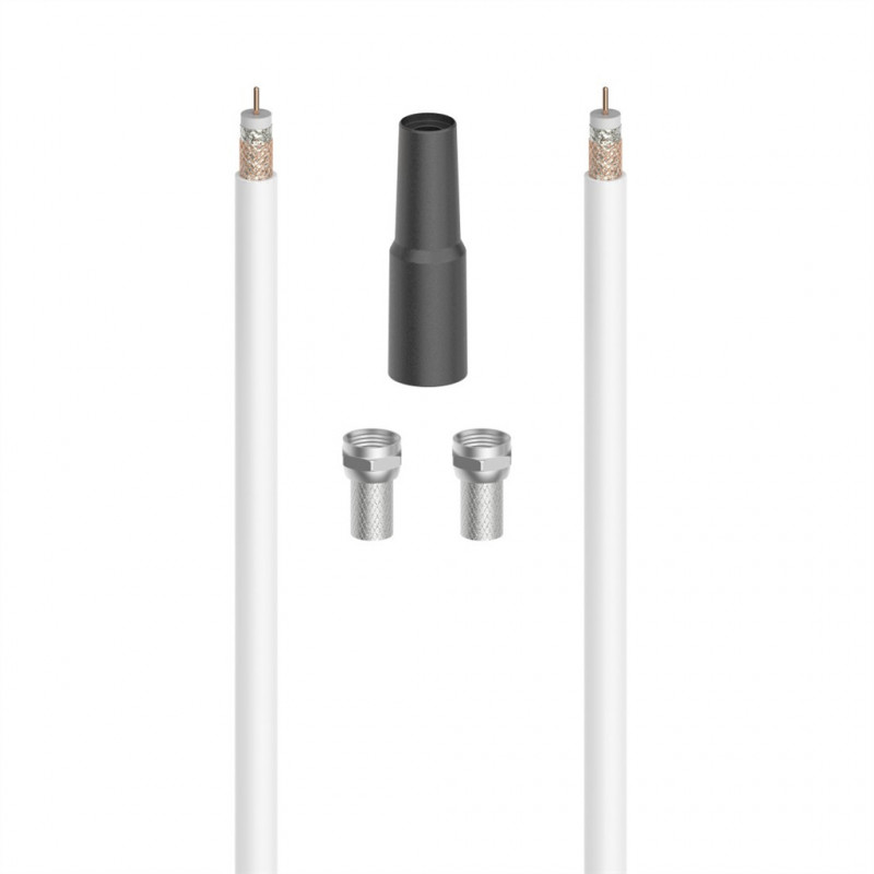 - obsah balenia: koaxiálny kábel (10 m, biely), 2x F-konektor, 1x ochranný návlek na konektor